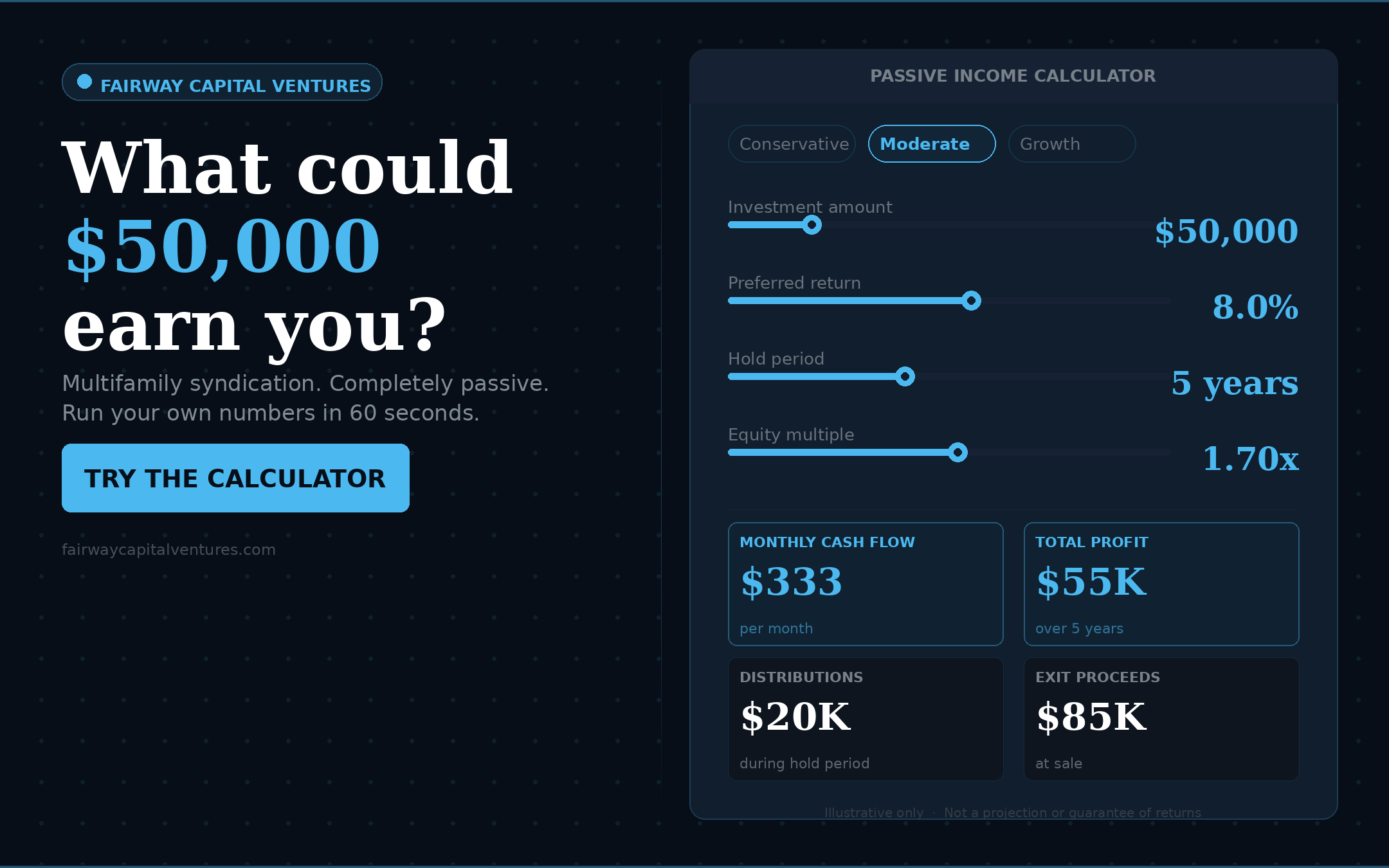 Depending on our exact exit plan for the specific deal, we could refinance and return all investor capital early or hold the deal to up to the 5 year mark and then sell off the property given what the market allows for returning all investor capital at the end of the hold period, while all this is happening investors are still getting portions of cash flow, appreciation and tax benefits as well.